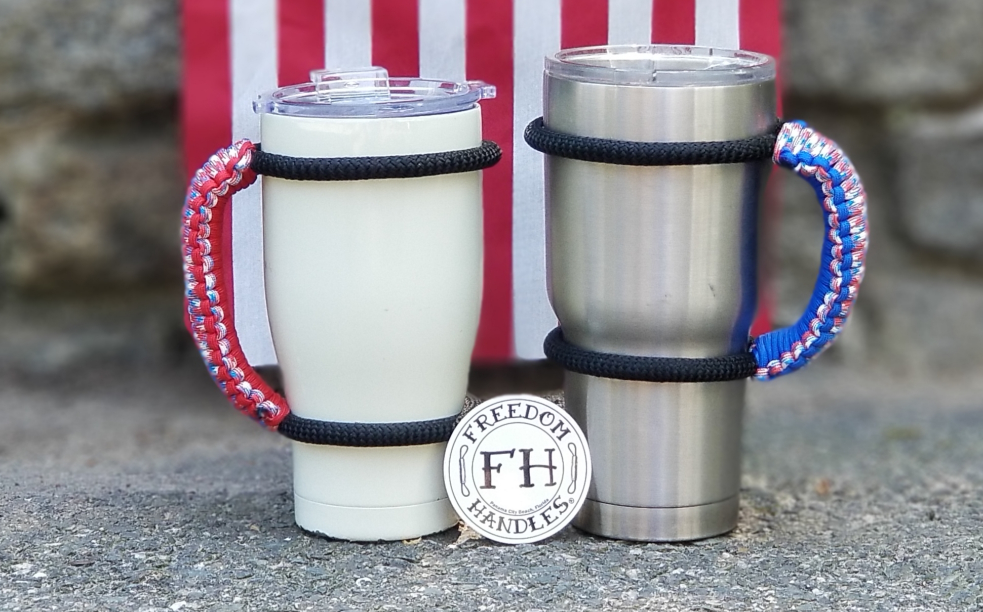 Handmade from Marine-grade shock cord & true 550 paracord manufactured in the USA, Freedom Handles will fit most brands of tumblers from 16 oz to 40 oz.